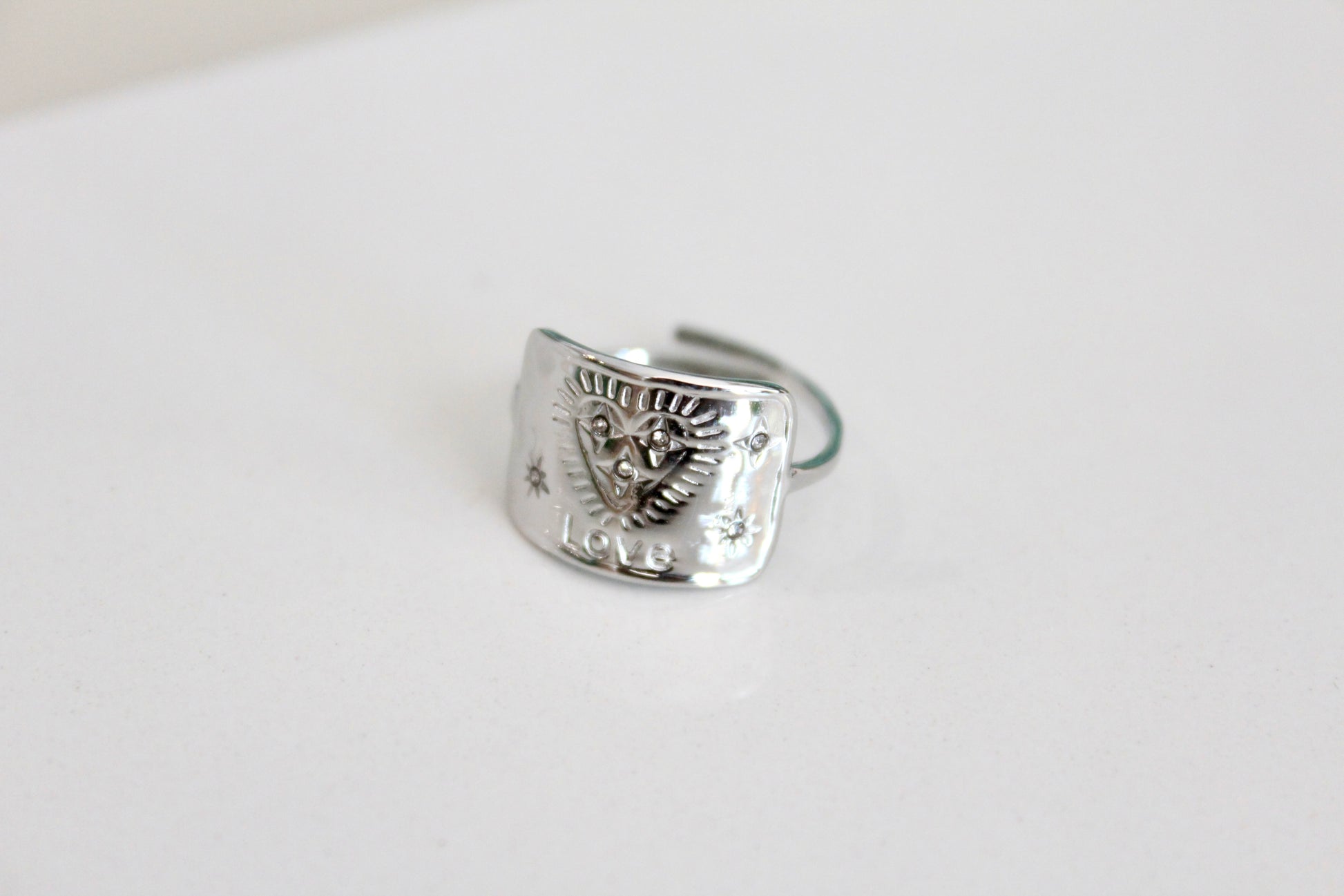 Anillo adaptable de acero inoxidable con grabado de corazón junto a la palabra 'LOVE'. Adornado con circonitas.